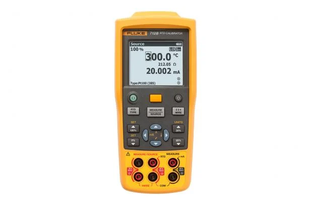 Fluke 712B RTD Calibrator is a handheld, battery-operated instrument that measures and sources a variety of RTD types and resistances. It also includes an isolated channel to measure 4-20 mA whiles sourcing a temperature signal. It offers configurable 0% and 100% source settings for quick 25% linearity checks. It also provides linear ramp and 25% step auto ramp functionality based on 0% and 100% settings.