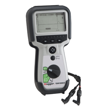 The TDR1000/3 advanced handheld time domain reflectometer (TDR) is a compact, single-channel TDR with mini clip test leads for locating faults on metallic cables. It has a minimum resolution of 0.1 m and a 5 km maximum range depending on velocity factor selected and cable type.